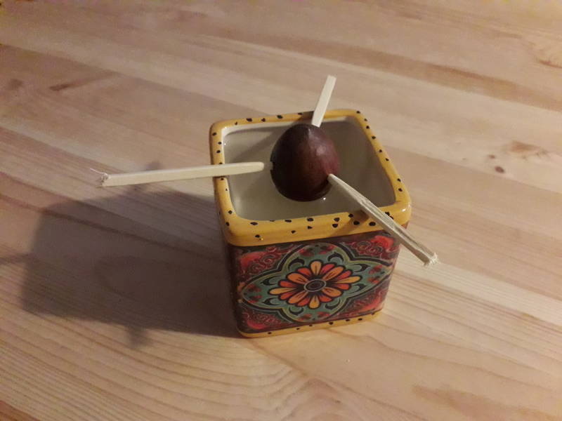 Stap 1: Verzamel de avocado pit die je uit de avocado hebt gehaald. Maak de pit eerst goed schoon met bijvoorbeeld keukenpapier. Zorg er verder voor dat je het bord, de 3 satéprikkers en het potje klaar hebt staan!