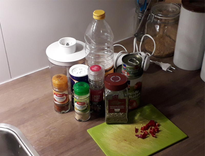 Stap 1: Verzamel alle ingrediënten en zorg ervoor dat de verse chilipeper grof is gesneden. Wanneer je verse knoflook gebruikt kun je gewoon de knoflookteentjes apart leggen. Gebruik dan ongeveer 1 à 2 knoflookteentjes. Voor de chilipeper gebruik je ongeveer een halve chilipeper.