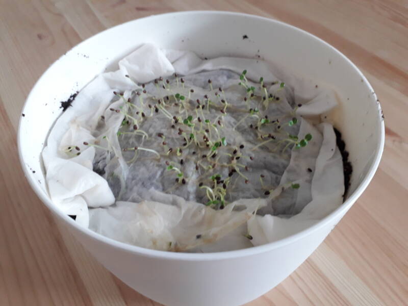 Stap 2: Haal de zaailingen voorzichtig, met keukenpapier en al, uit de plastic zak en leg het voorzichtig op de stekgrond. Zorg er goed voor dat de oppervlakte redelijk vlak is. De reden dat ik het met keukenpapier en al doe is dat de wortels nu niet beschadigd worden.